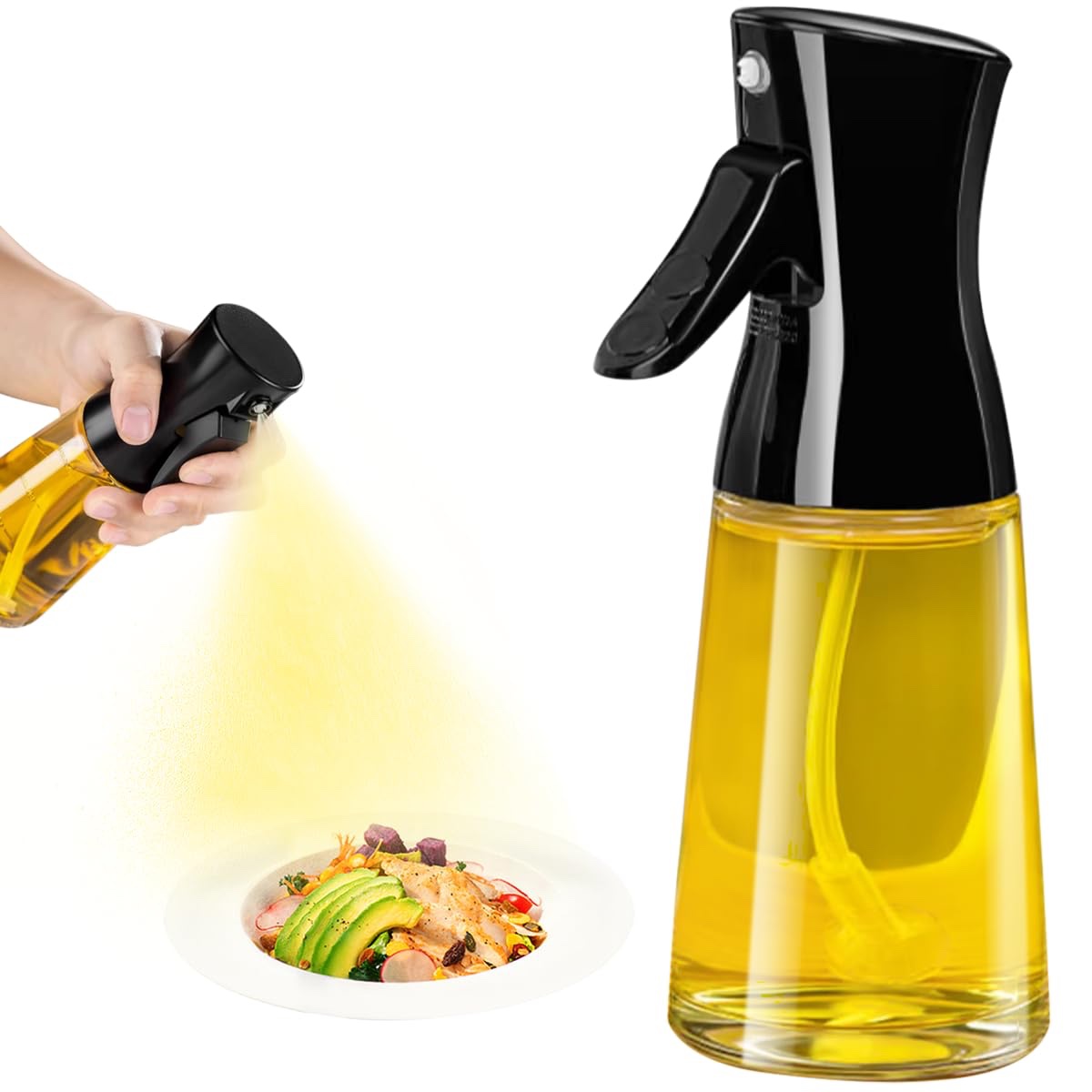 - 【NEW FUNCTIONAL UPGRADED DESIGN】: The oil spray bottle has a built-in filtration system to avoid nozzle clogging. The unique buckle design prevents accidental oil leakage and has a drip-proof trigger, which is convenient to carry for outdoor activities such as barbecues and picnics. Suitable for all types of cooking liquids, such as olive oil, avocado oil, soy sauce, wine, canola oil, water, etc.